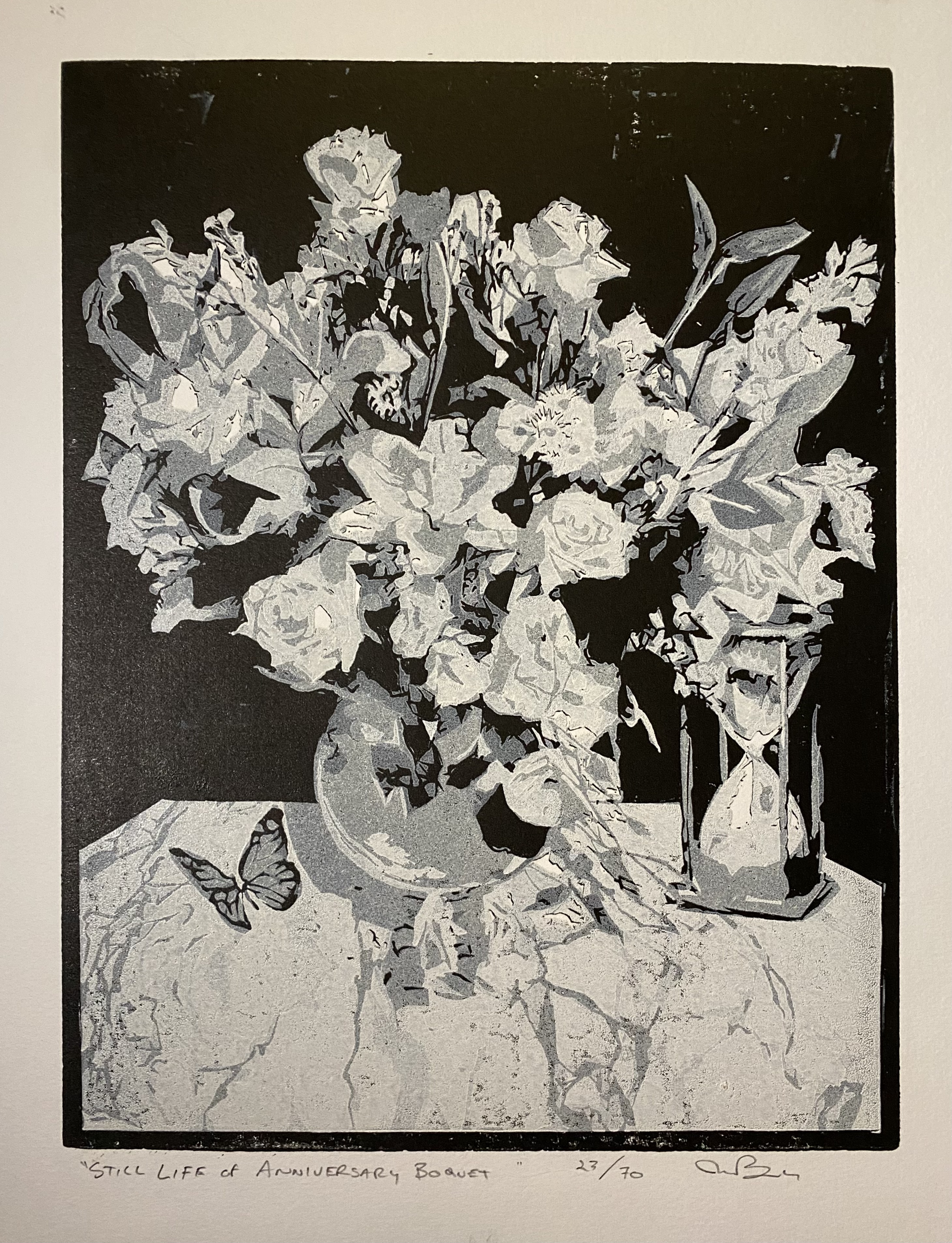 “Still Life Of Anniversary Bouquet” is six plates printed onto BFK Rives Printmaking Paper, White, 300 GSM. It was made using a home made printing press. This was a run of 70 prints and they were given away as a gift to guests who attended our wedding.