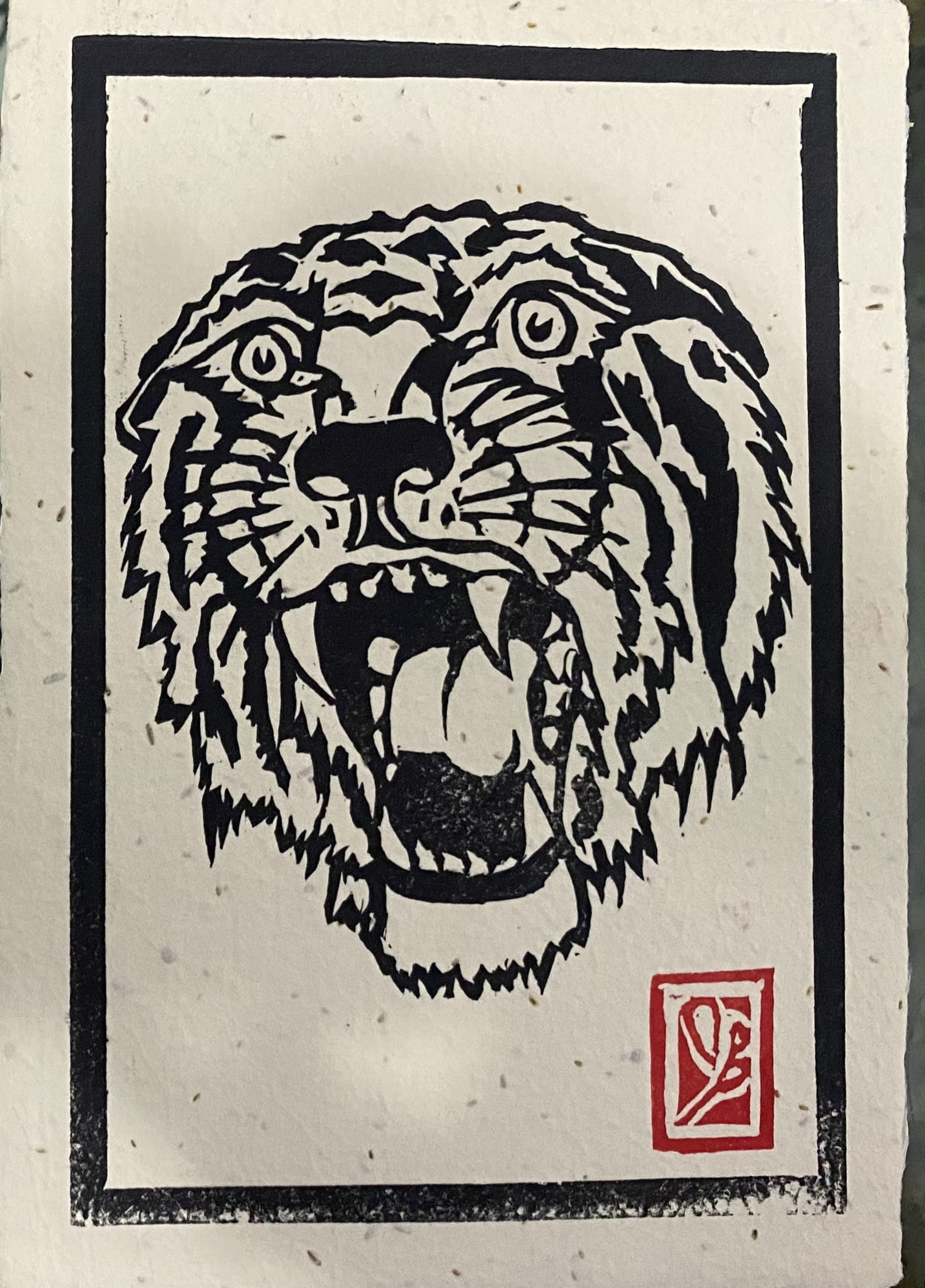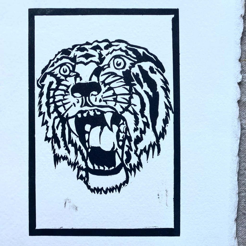 Tagged as art, block print, classic tattoo, lino, linoprint, print, printmaking, relief print, sailor jerry, tattoo, tiger, traditional tattoo, woodblock