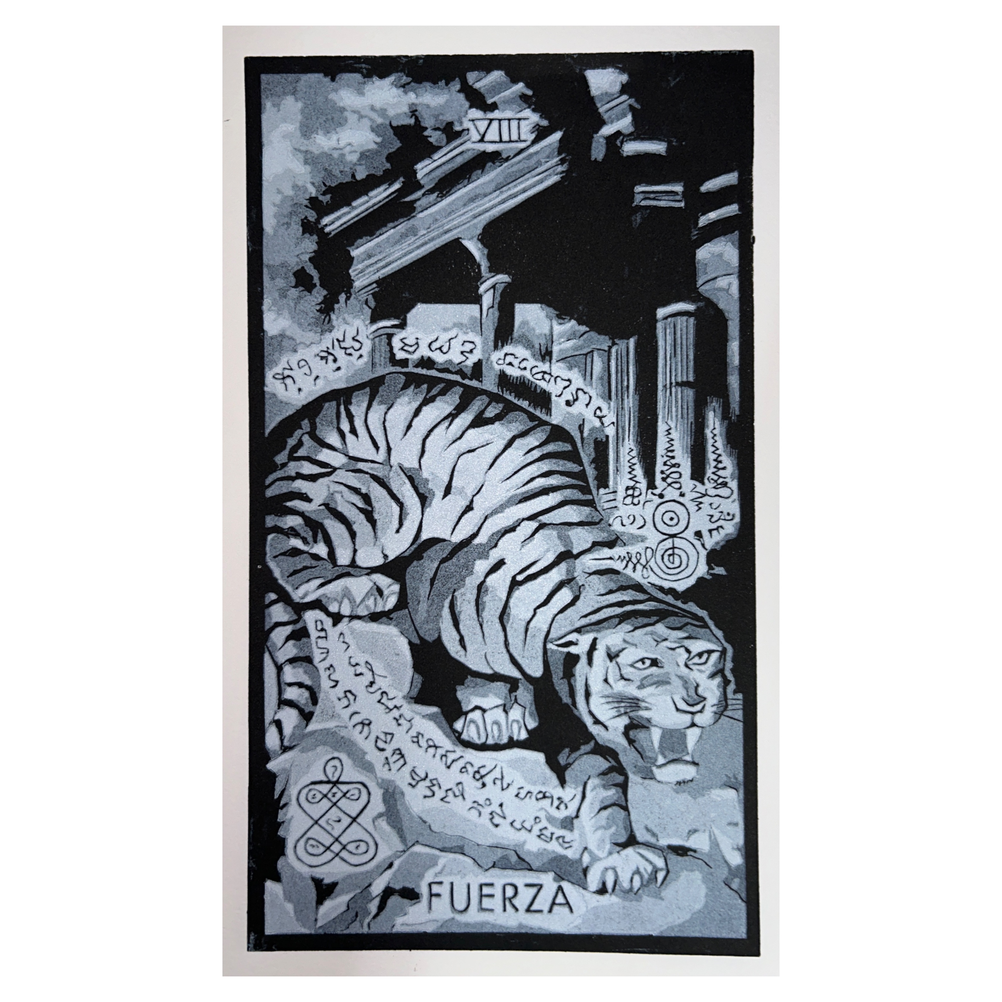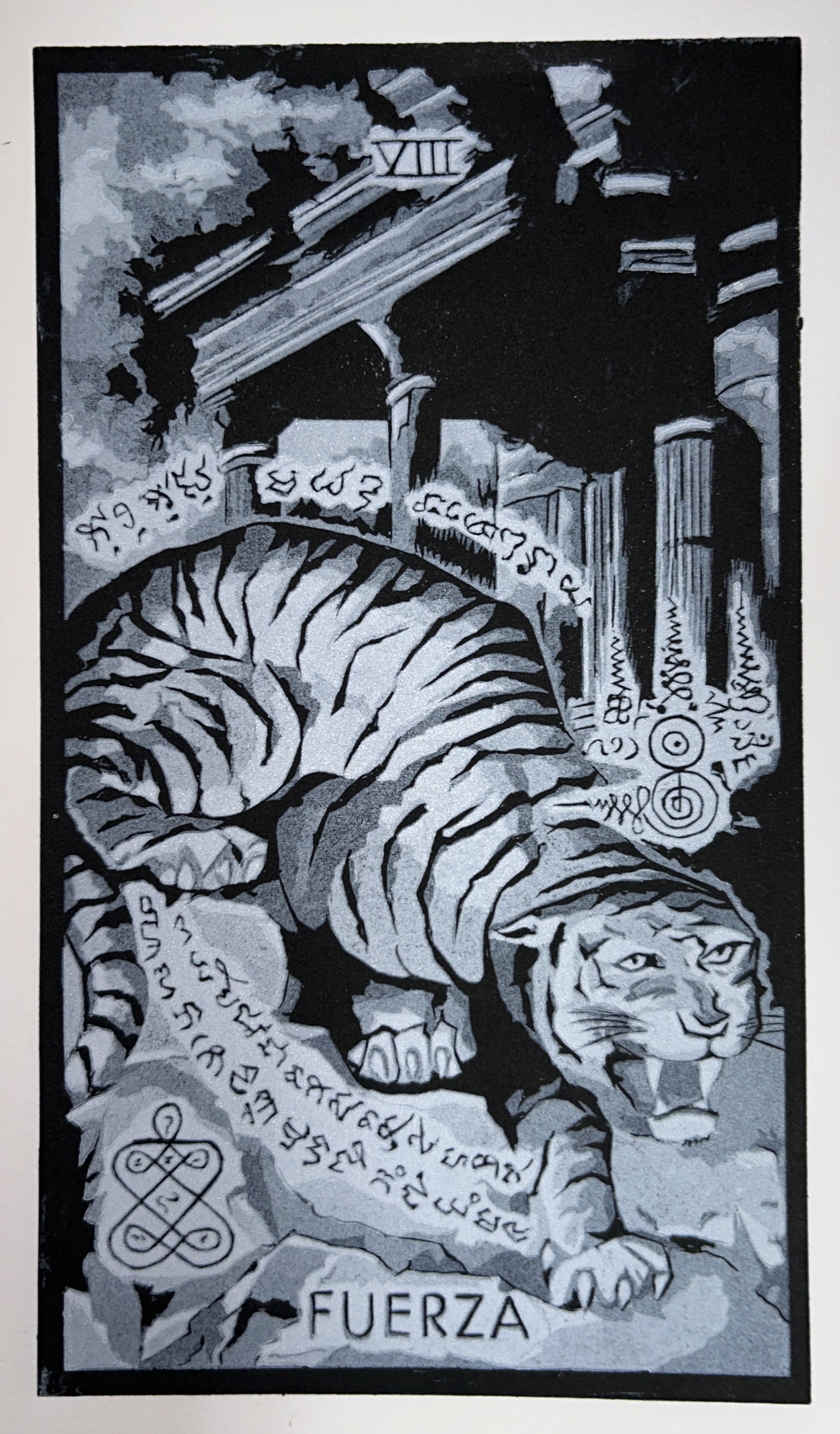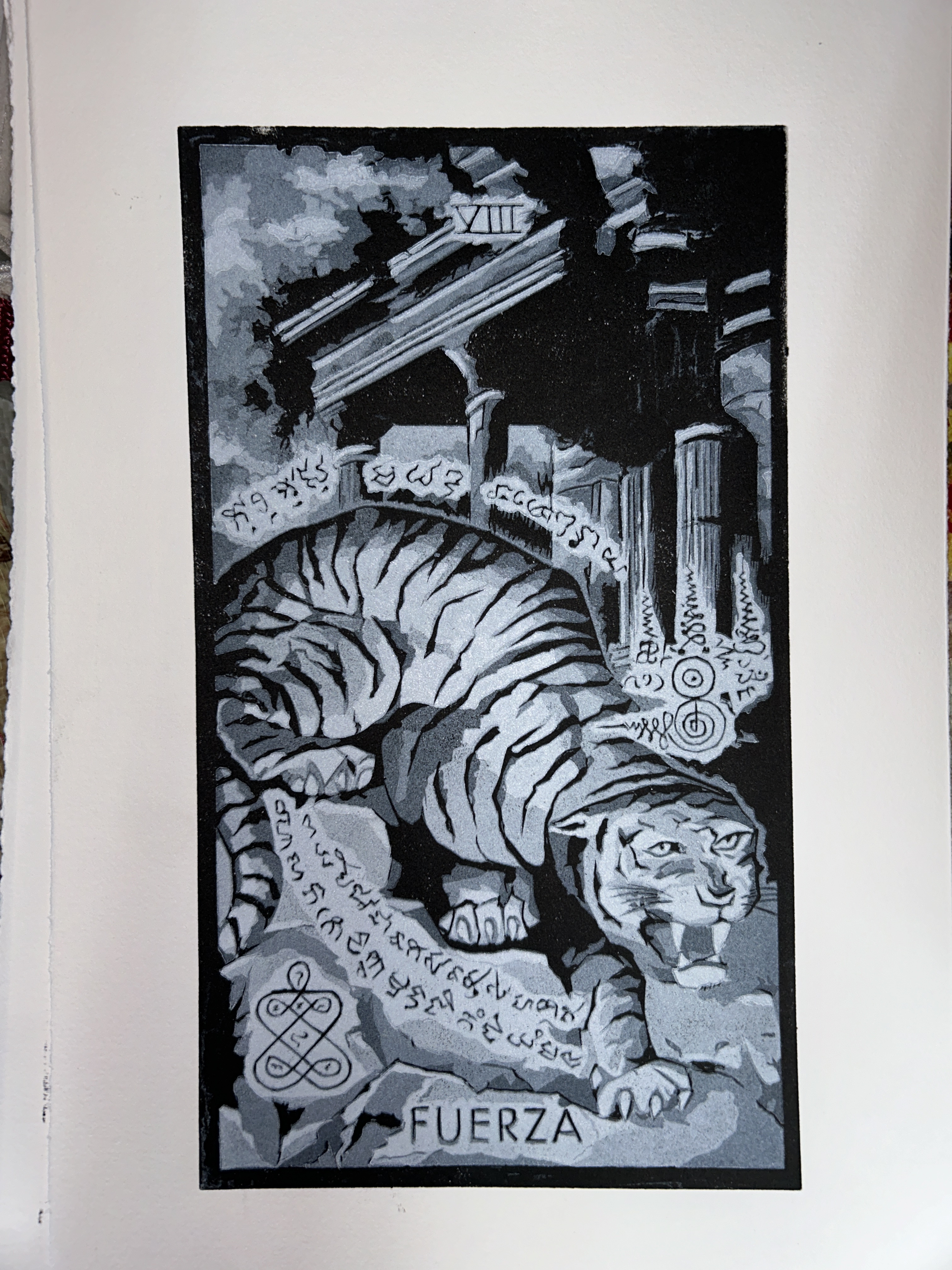 Tagged as Ben Leib, black and white, la fuerza, linoleum, linoprint, loteria, print, printmaking, reduction print, relief print, sak yant, tarot, tiger, woodblock