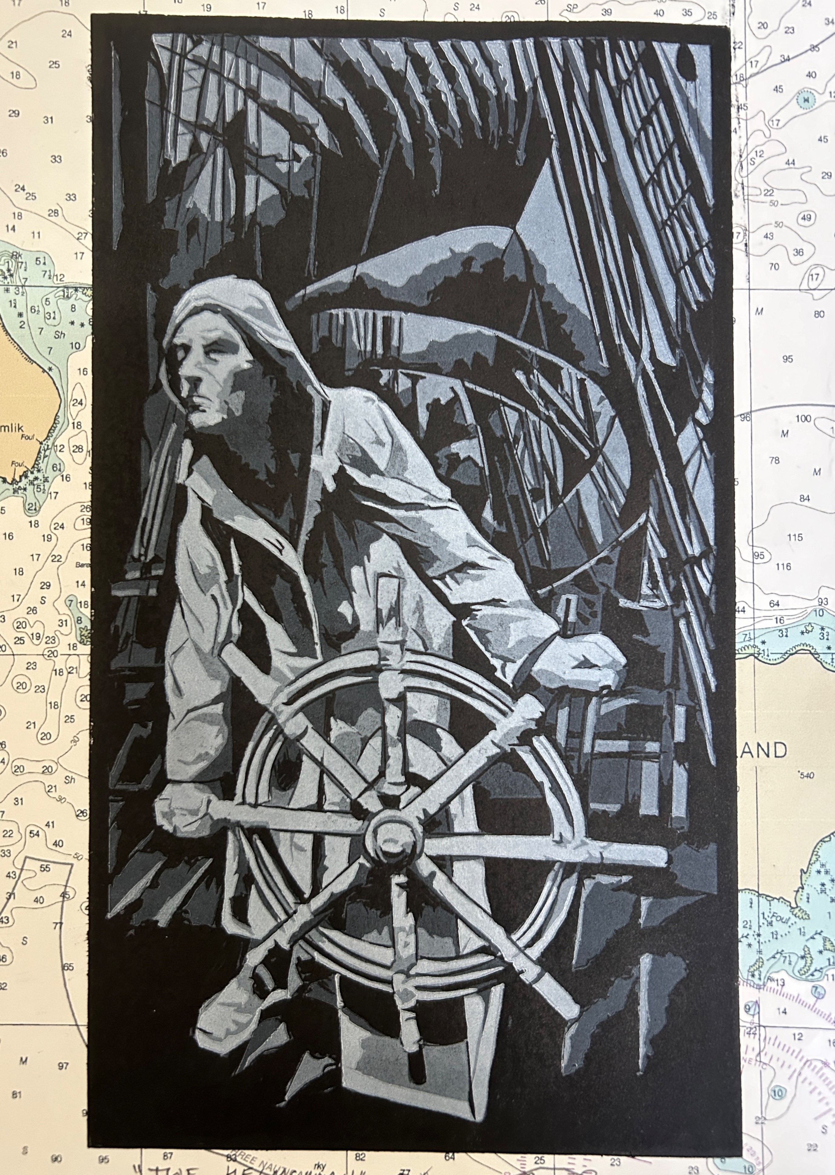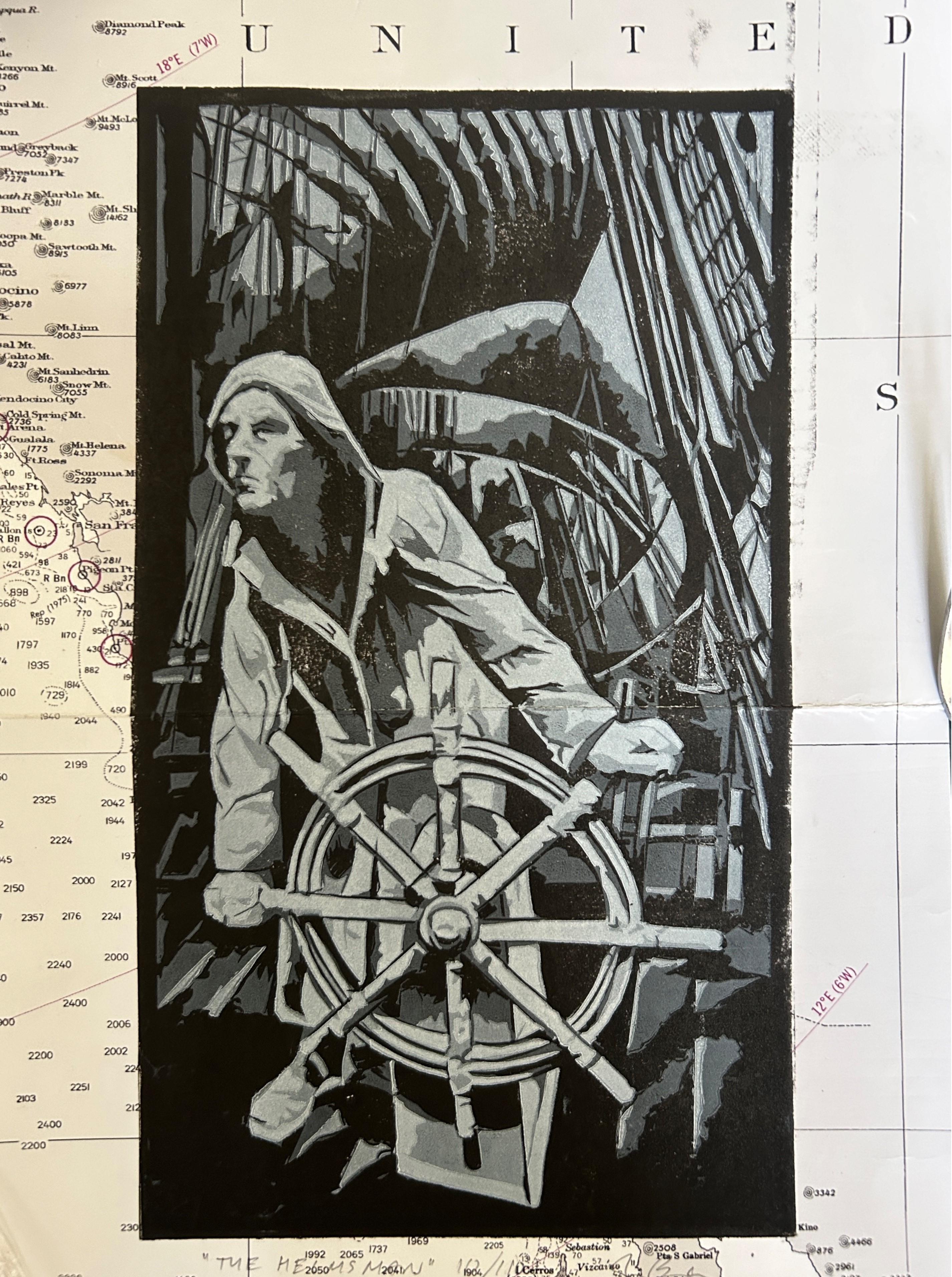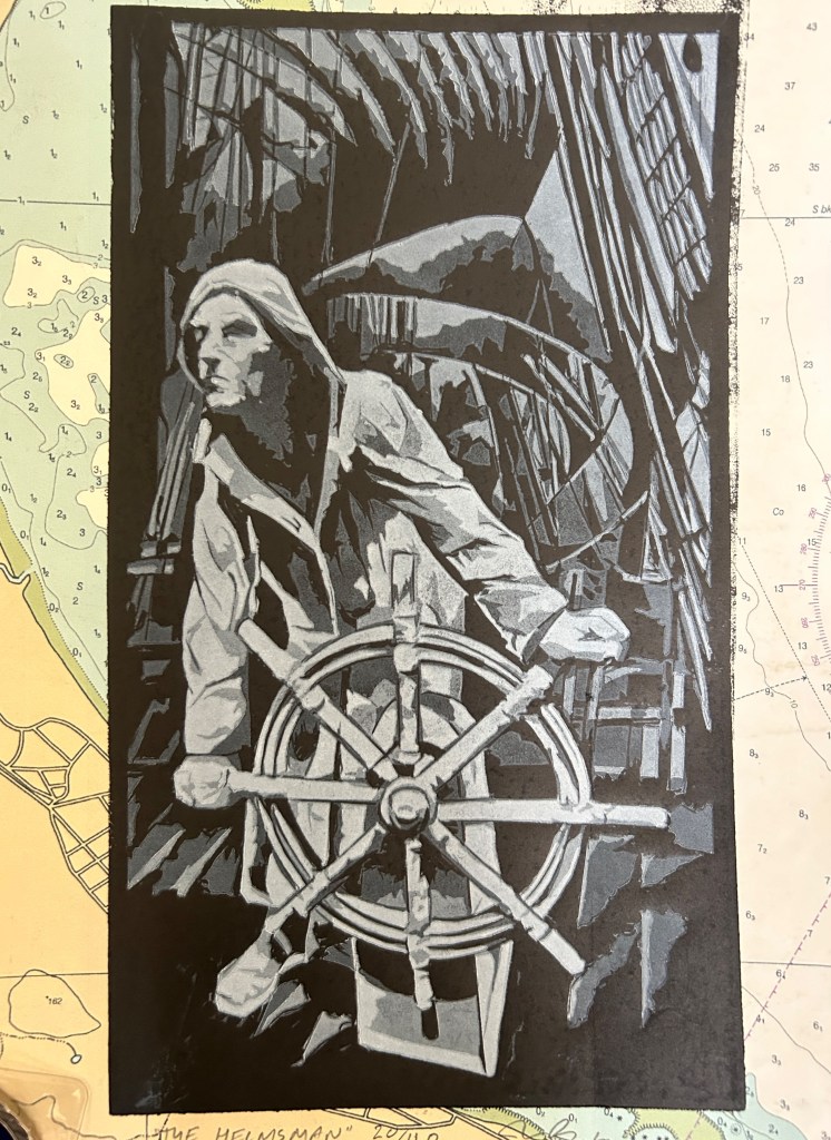 “The Helmsman” is five plates printed onto navigational charts that had been in use onboard Foss tugboats, SeaCor’s Ocean Giant, and APL’s President Wilson. They were printed using a homemade printing press.