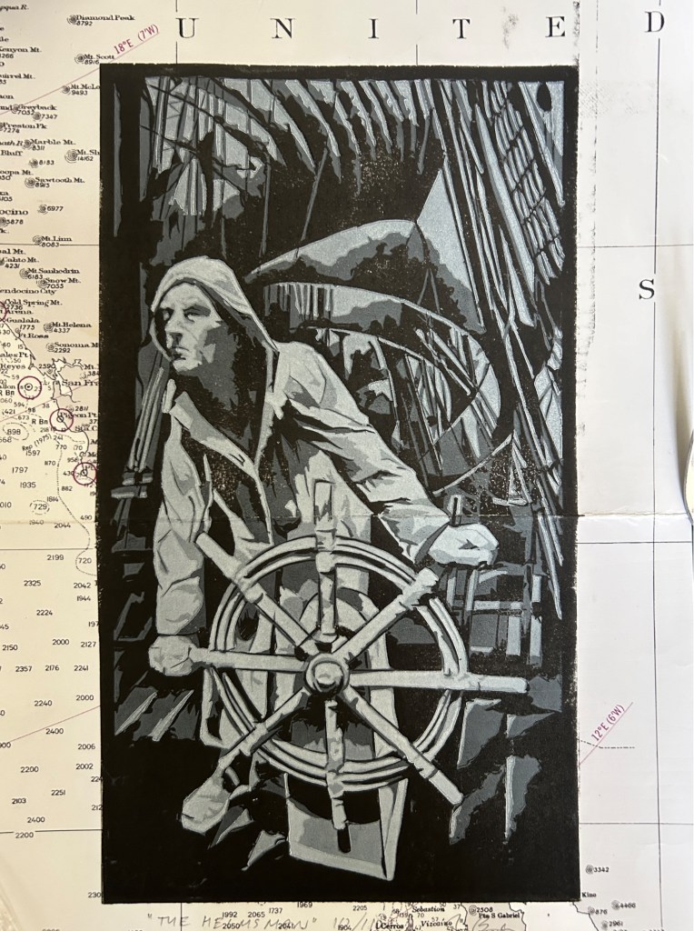 Tagged as Ben Leib, block print, captain, chart, helmsman, linoprint, map, merchant marine, ocean, print, printmaking, relief print, sailboat, sailing, sailing ship, shipping, tall ship, woodblock
