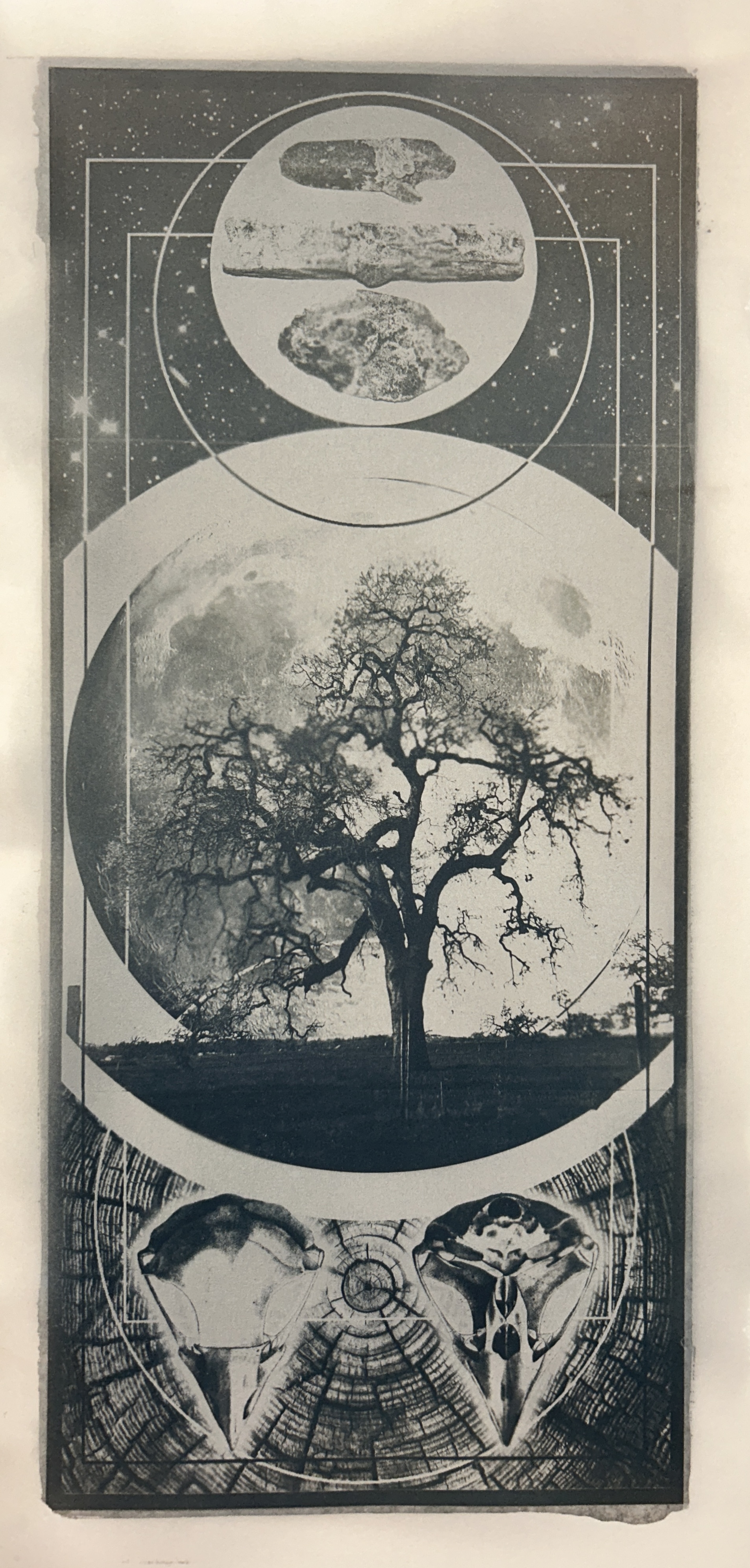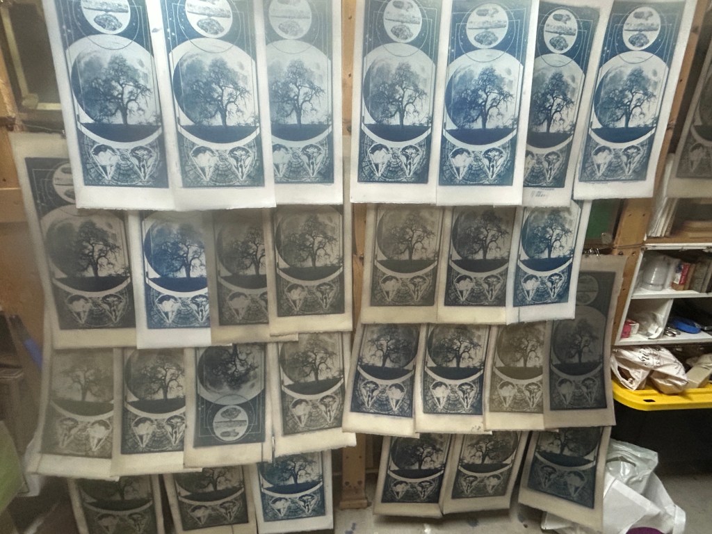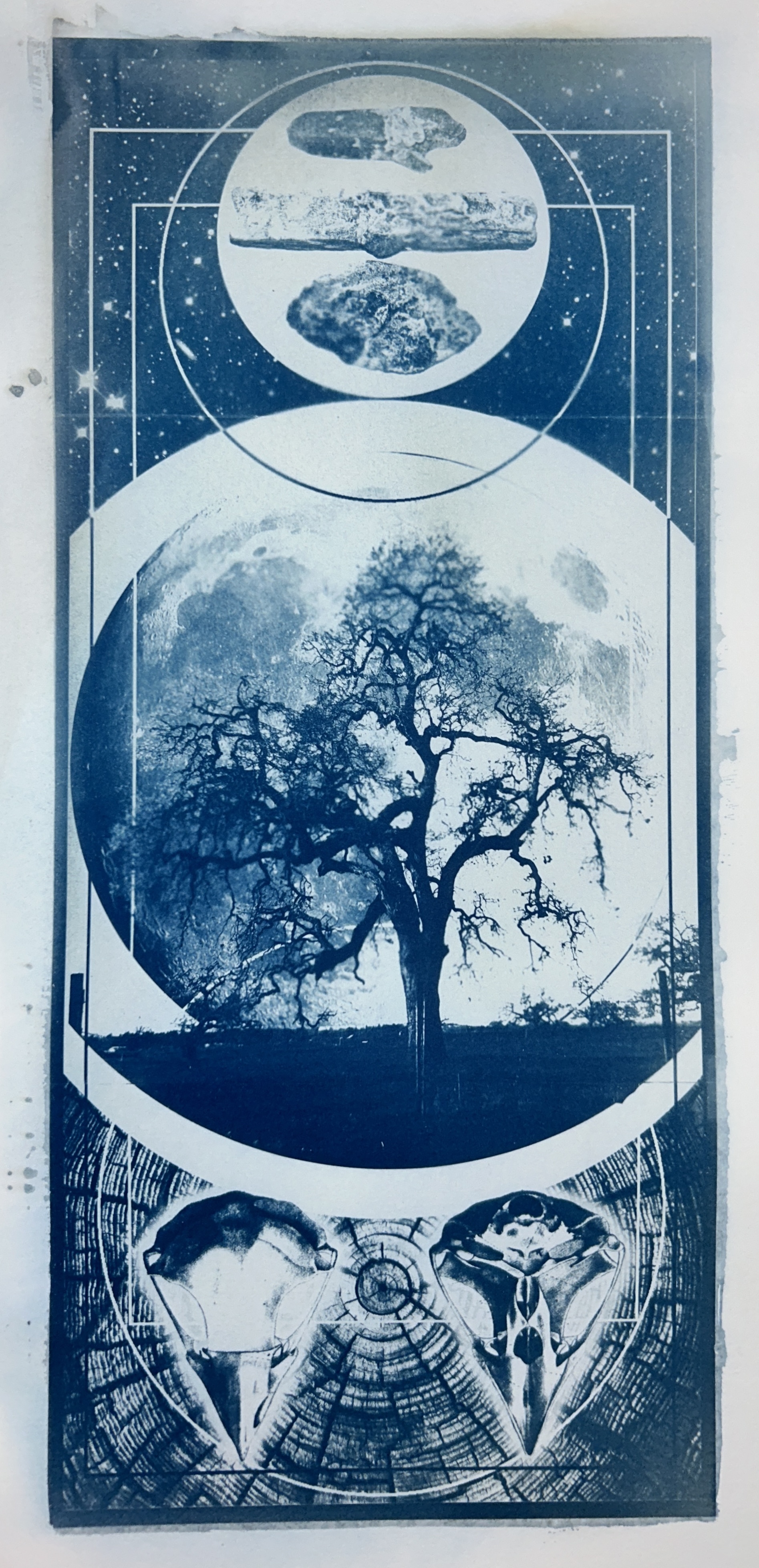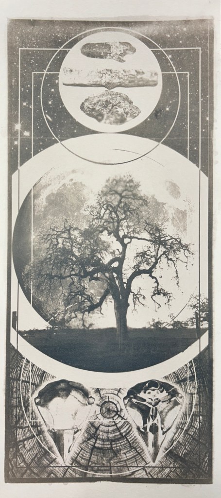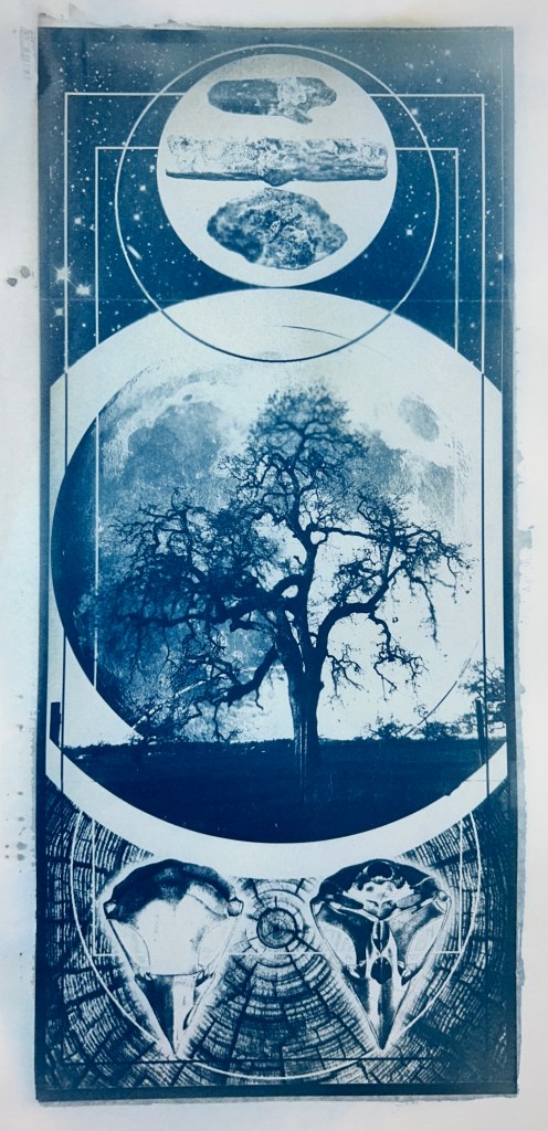 “To Guard Against Hexes Cast” is a cyanotype printed on Canson watercolor paper and onto Arches Platine paper. The prints are toned with coffee and the image measures 8″ x 18″.