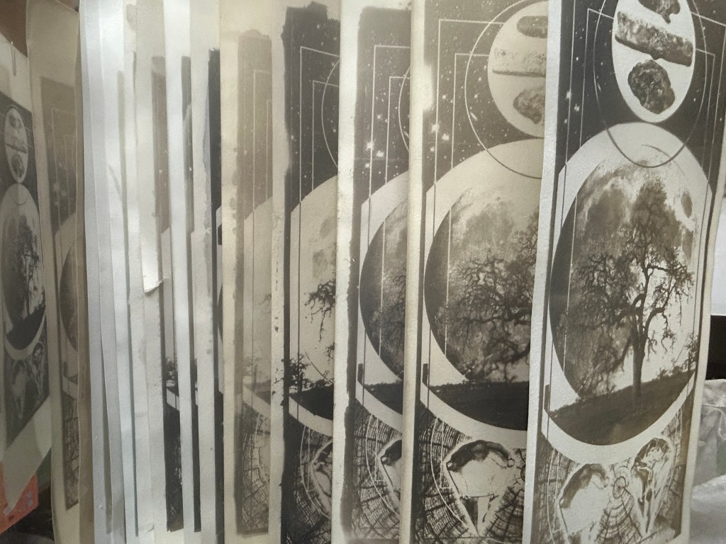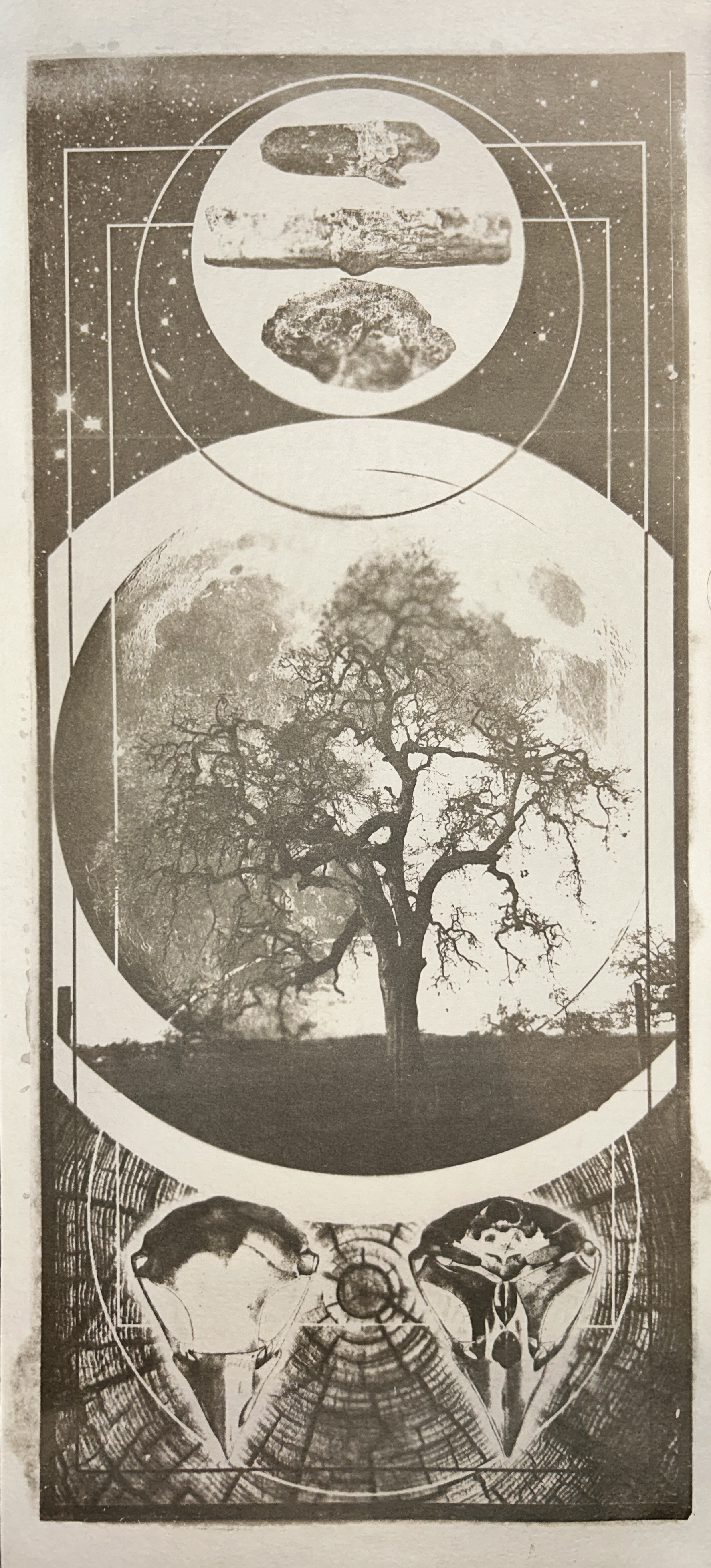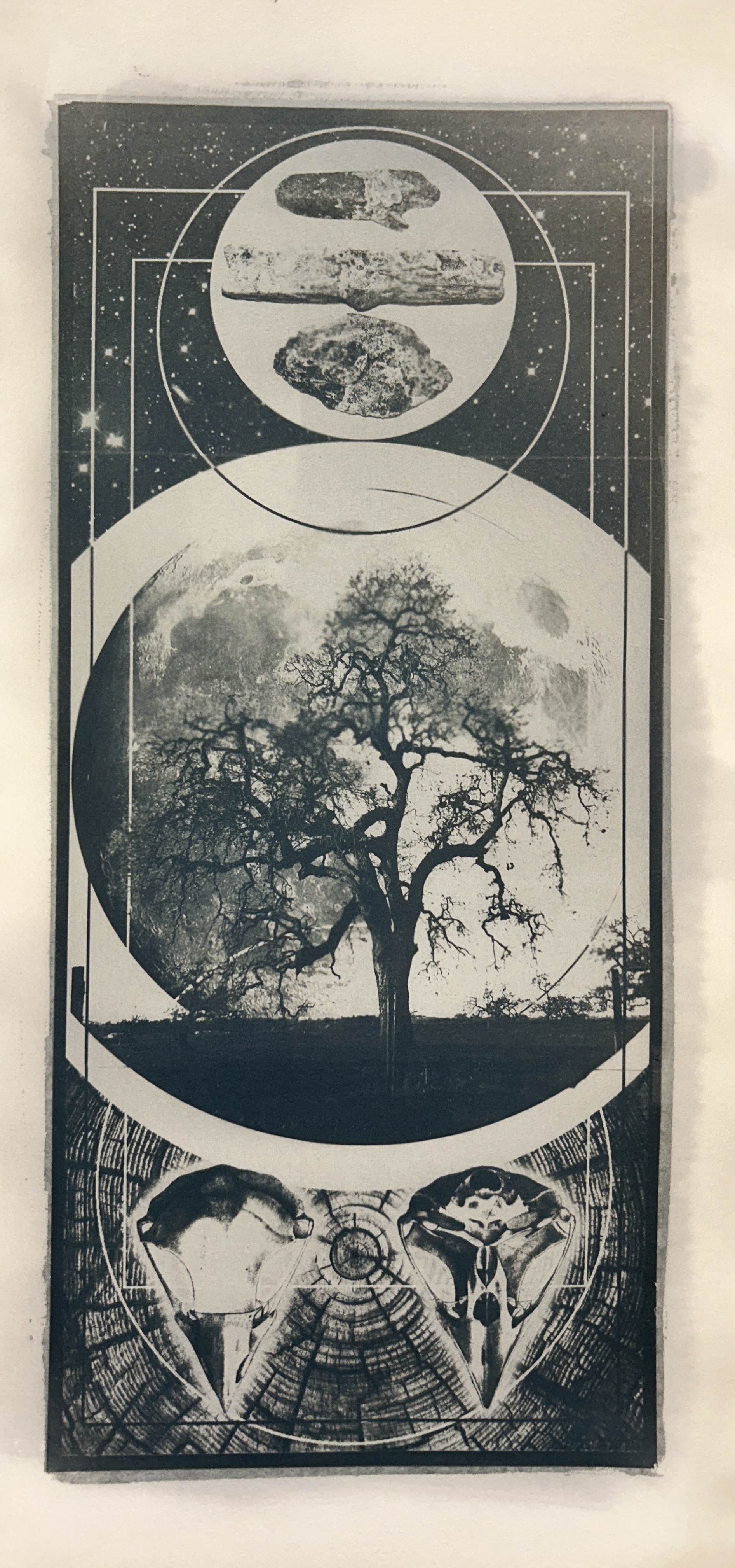“To Guard Against Hexes Cast” is a cyanotype printed on Canson watercolor paper and onto Arches Platine paper. The prints are toned with coffee and the image measures 8″ x 18″.